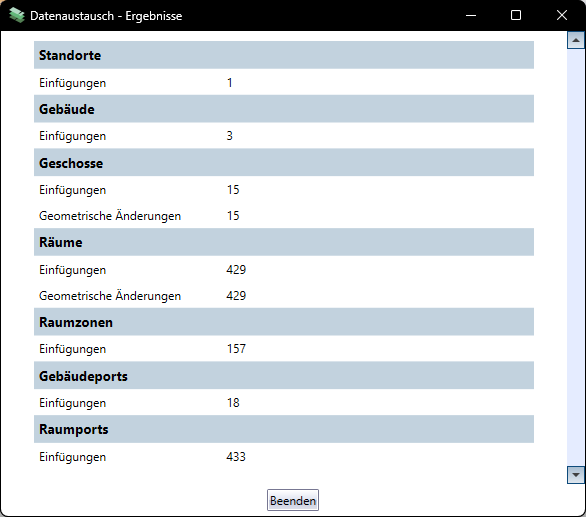 Hierbei wird beim Abschluss des Prozesses noch eine kleine Statistik angezeigt. In dieser werden die Änderungen der Daten zusammengefasst.