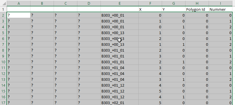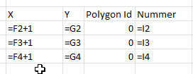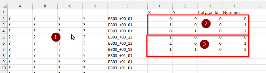 - Anschließend die Daten im Rechteck 3 markieren und nach unten ziehen (rechtes kleines Rechteck an der Markierung). Die X-Werte werden dabei stufenweise hochgezählt, wobei Y, Polygon-Id und Nummer im obigen Schema gleichbleiben.