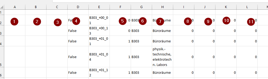 - In den Spalten A-D (1-4) und F-L (5-11) die Daten entfernen, sodass nur die Raumnummern übrig bleiben.