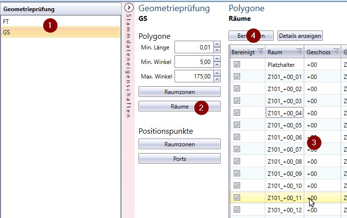 - Button Räume (2) ausführen und in der Tabelle alle Daten markieren (3) und Button Bereinigen (4); Damit werden grobe Geometriefehler beseitigt und übrig bleiben die Räume mit keiner Geometrie.