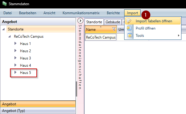 Das Löschen eines Gebäudes (hier: Haus 5) erfolgt über die Import-Tabellen, da hier ein kaskadierendes Löschen ermöglicht wird. Hierzu werden die Stammdaten aufgerufen und im Menü-Punkt (1) Import > Import Tabellen öffnen ausgewählt.