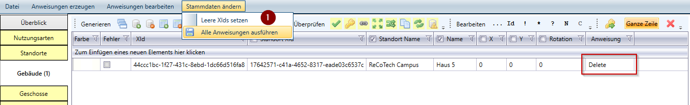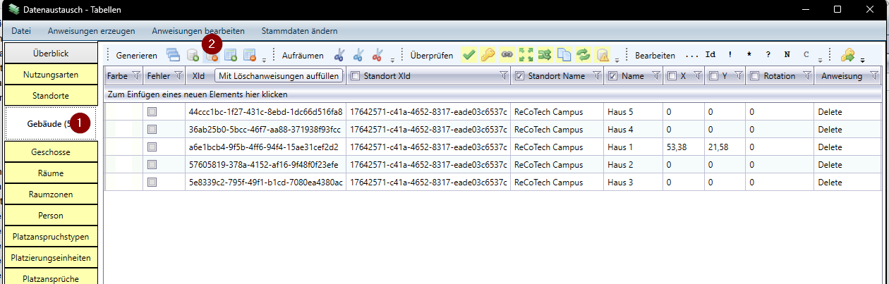 Die Importtabelle öffnen sich in diesem Falle ohne Daten (leer). Nun wird die Datenebene ausgewählt, welche bearbeitet werden soll. In diesem Falle der Tab Gebäude (1). Da ein Gebäude entfernt werden soll, können die Daten aus der Datenbank mit Löschanweisungen geladen (2) werden. Hierbei werden zunächst alle Gebäude mit deren Eigenschaften in die Ansicht geladen und die Anweisungsspalte auf "Delete" gesetzt. Dies bewirkt beim Ausführen, dass nun alle Gebäude entfernt werden würden.