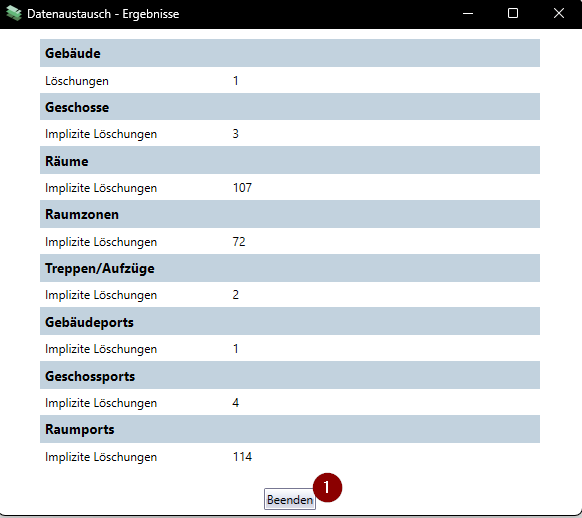 Sobald die Aktion erledigt wurde, wird eine Statistik des Vorgangs als Zusammenfassung angezeigt. Hier ist das kaskadierende Löschen ersichtlich, da nicht nur das Gebäude, sondern auch die Räume, Zonen, Türen, ... entfernt wurden. Diese Statistik kann nun geschlossen werden (1).